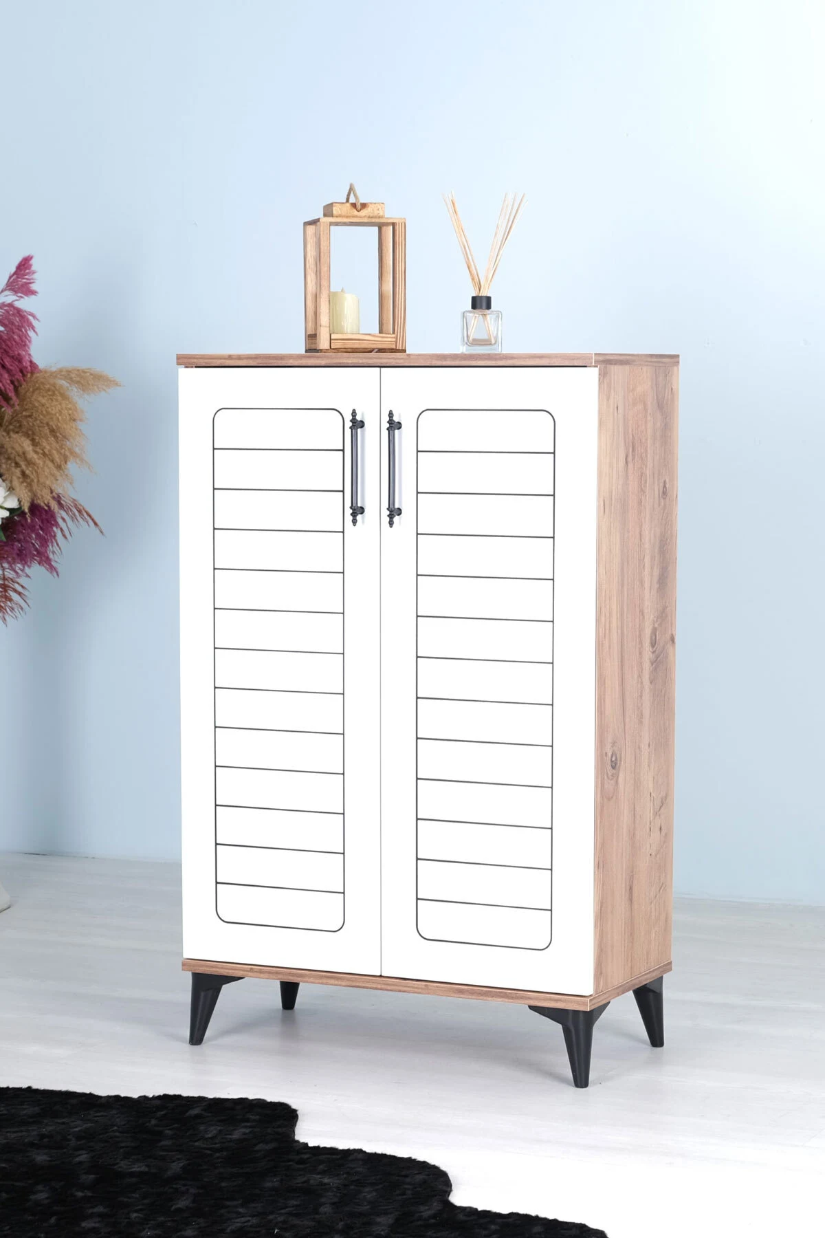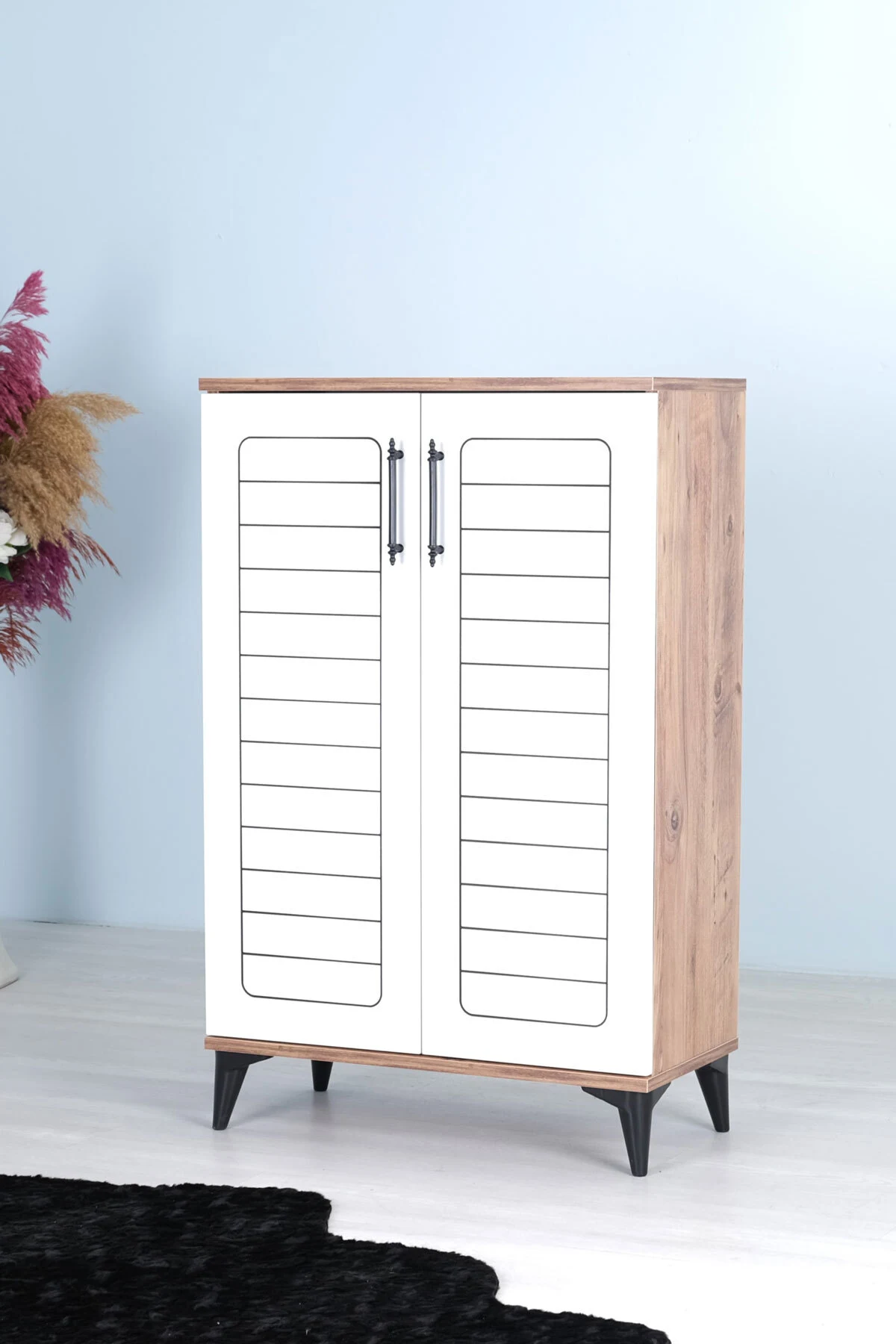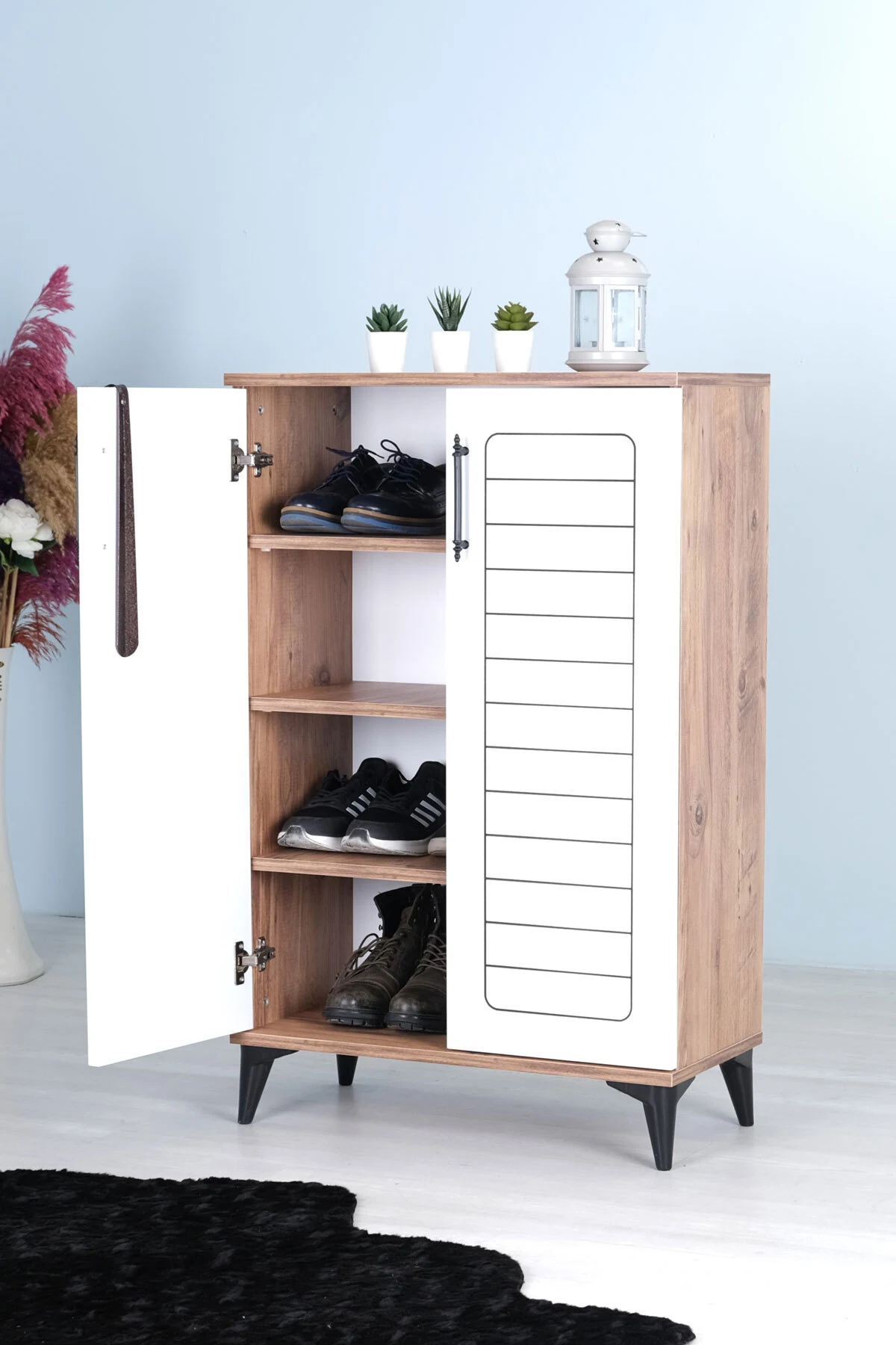 Luna 2 Kapaklı 4 Bölmeli Modern Ayakkabılık – Beyaz / Çam Desenli | 70x108x35 Cm