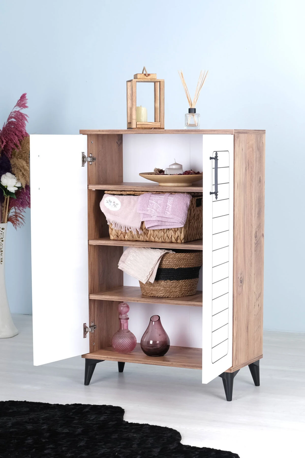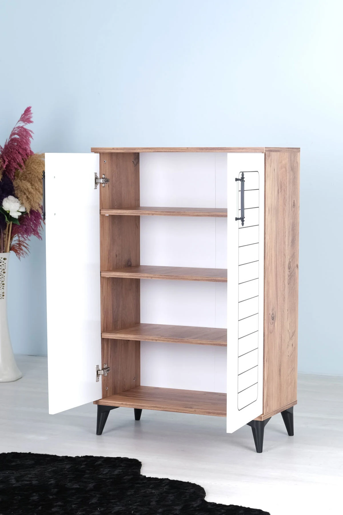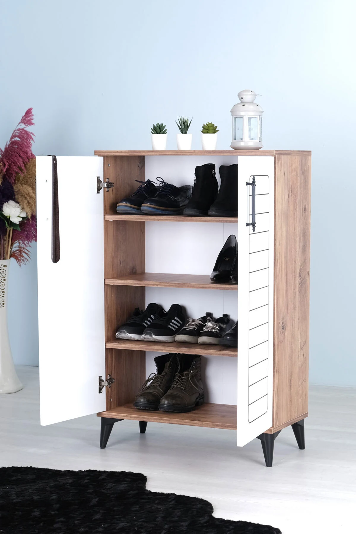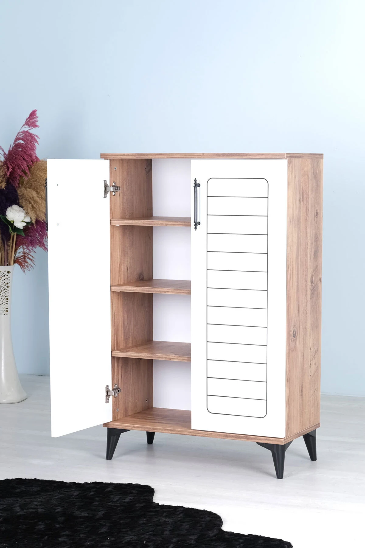 Luna 2 Kapaklı 4 Bölmeli Modern Ayakkabılık – Beyaz / Çam Desenli | 70x108x35 Cm