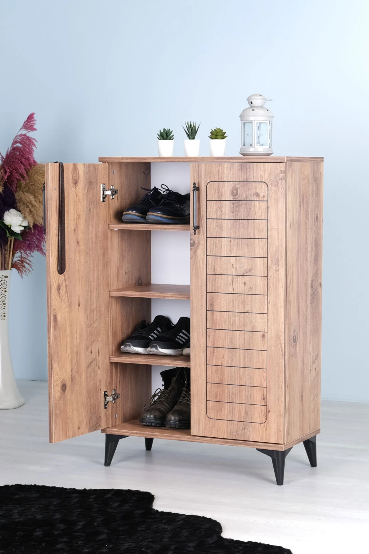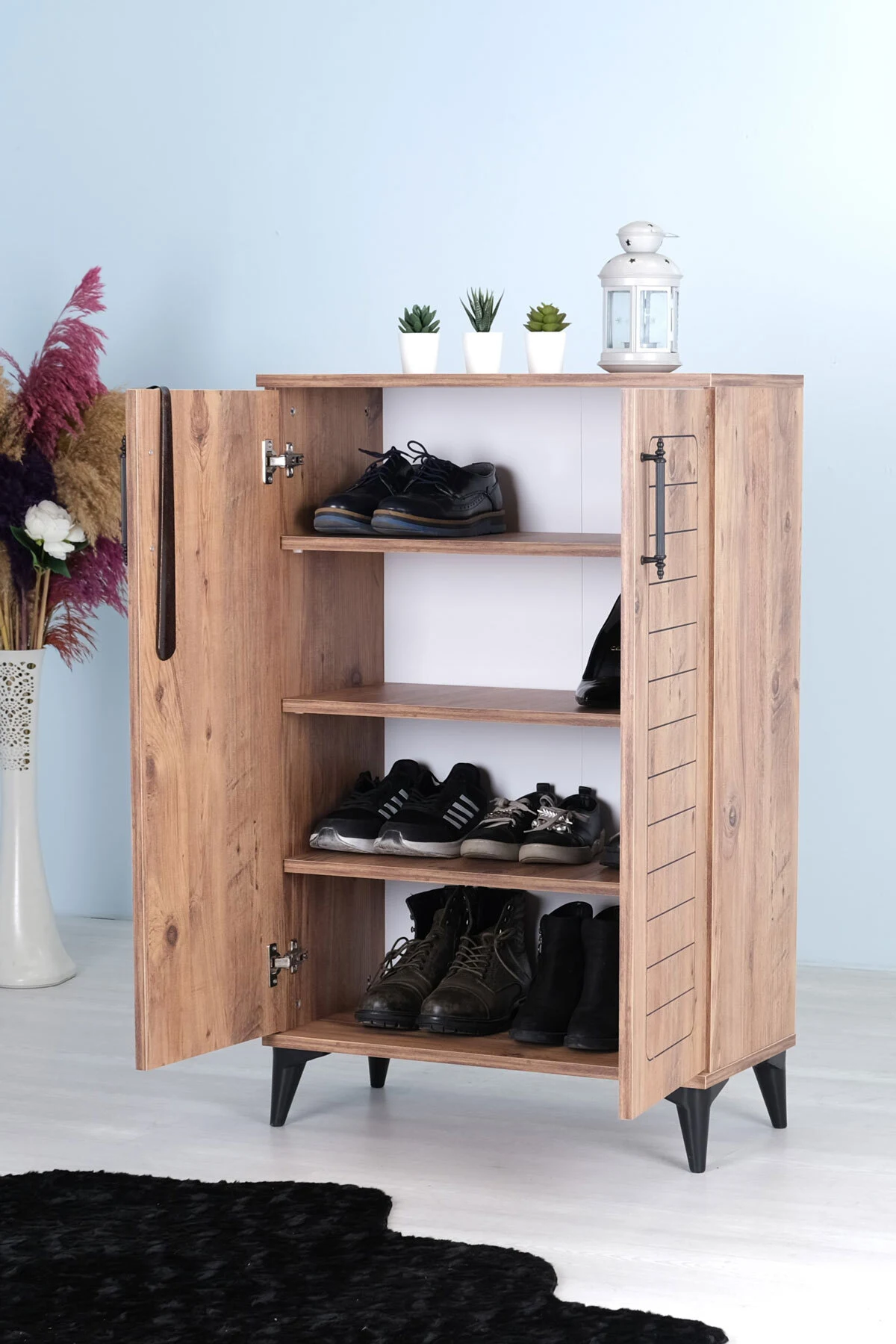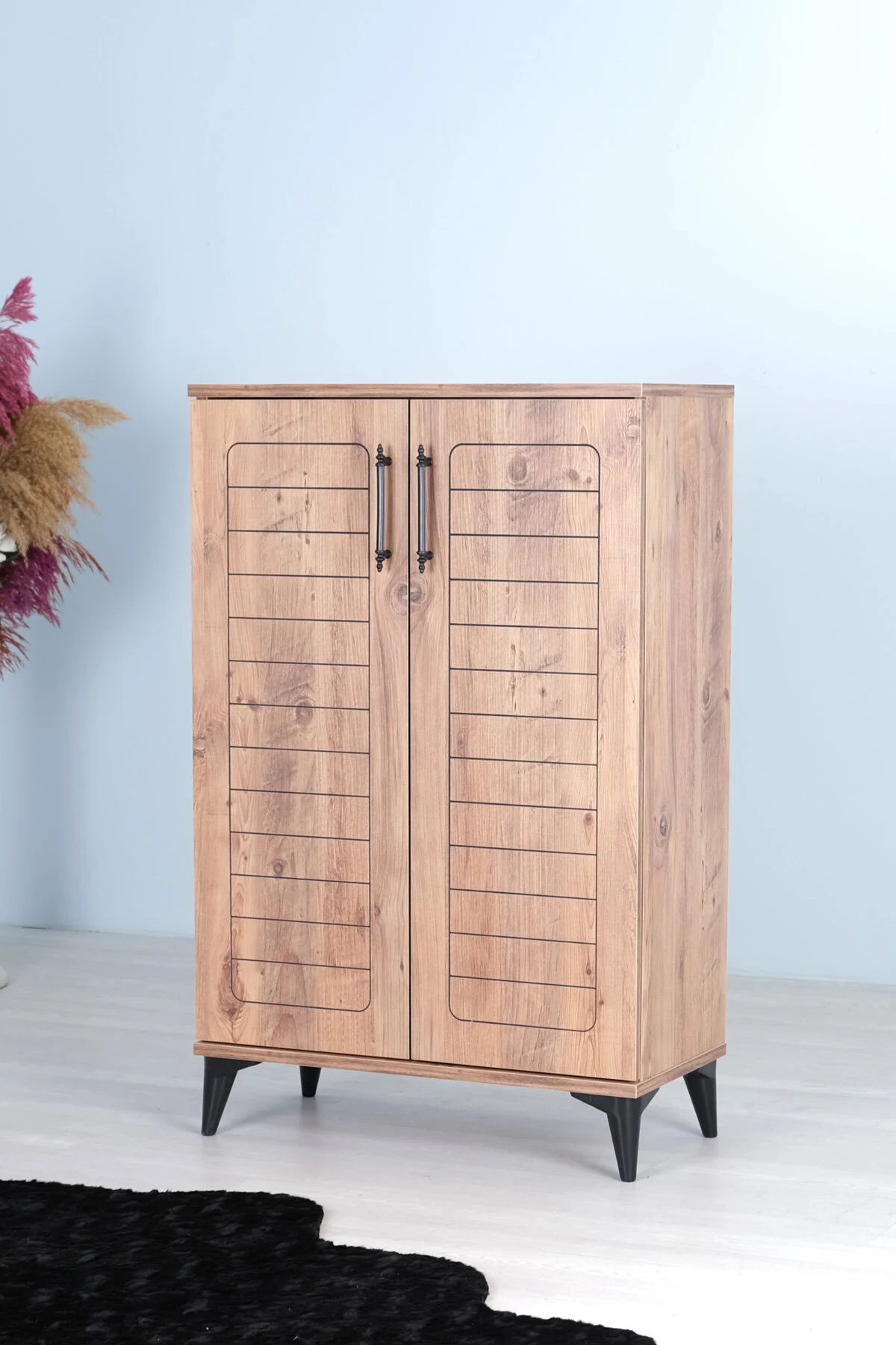 Luna 2 Kapaklı 4 Bölmeli Modern Ayakkabılık – Çam Desenli | 70x108x35 Cm