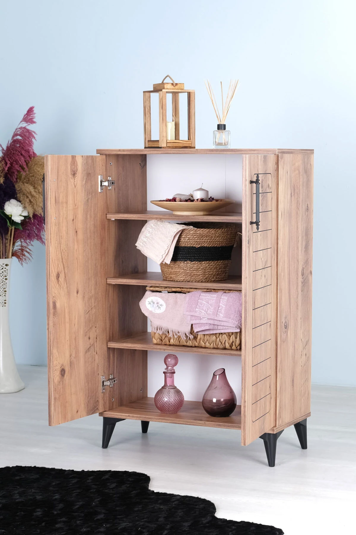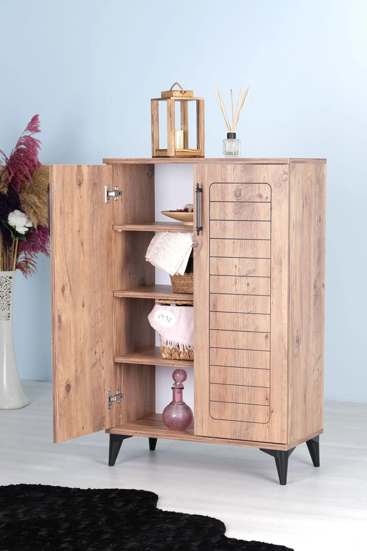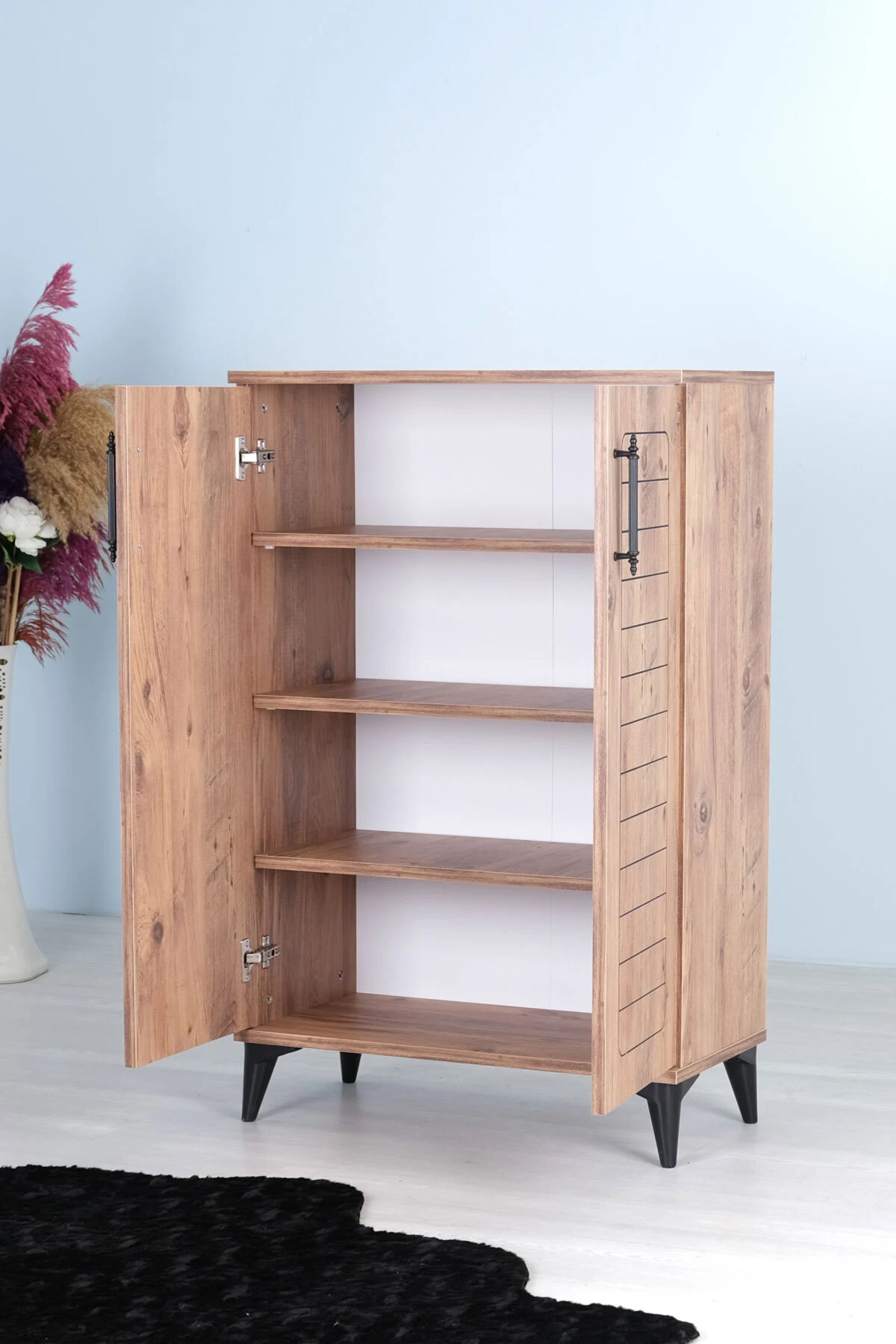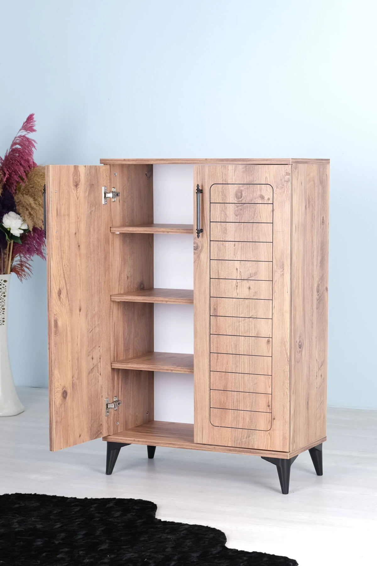 Luna 2 Kapaklı 4 Bölmeli Modern Ayakkabılık – Çam Desenli | 70x108x35 Cm